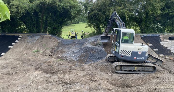 By Saturday, a further area of channel had been prepared ready for lining and blocking. The current work area is characterised by a couple of very significant features. Access: there is no haul road, the only access is achieved via a gap in the towpath embankment, created decades ago, which will have to be filled in as the last step to completing this section. As we now work from both directions towards exiting via this gap, the remaining area becomes increasingly congested and plant manoeuvrability reduces. Channel dimensions: by the access point, the channel widens out substantially on a bend. The dimensions vary constantly and much greater quantities of materials are required compared with the rest of the channel. Nevertheless, the gap left to be lined and blocked has reduced significantly – 19 metres of (very wide) channel remains.